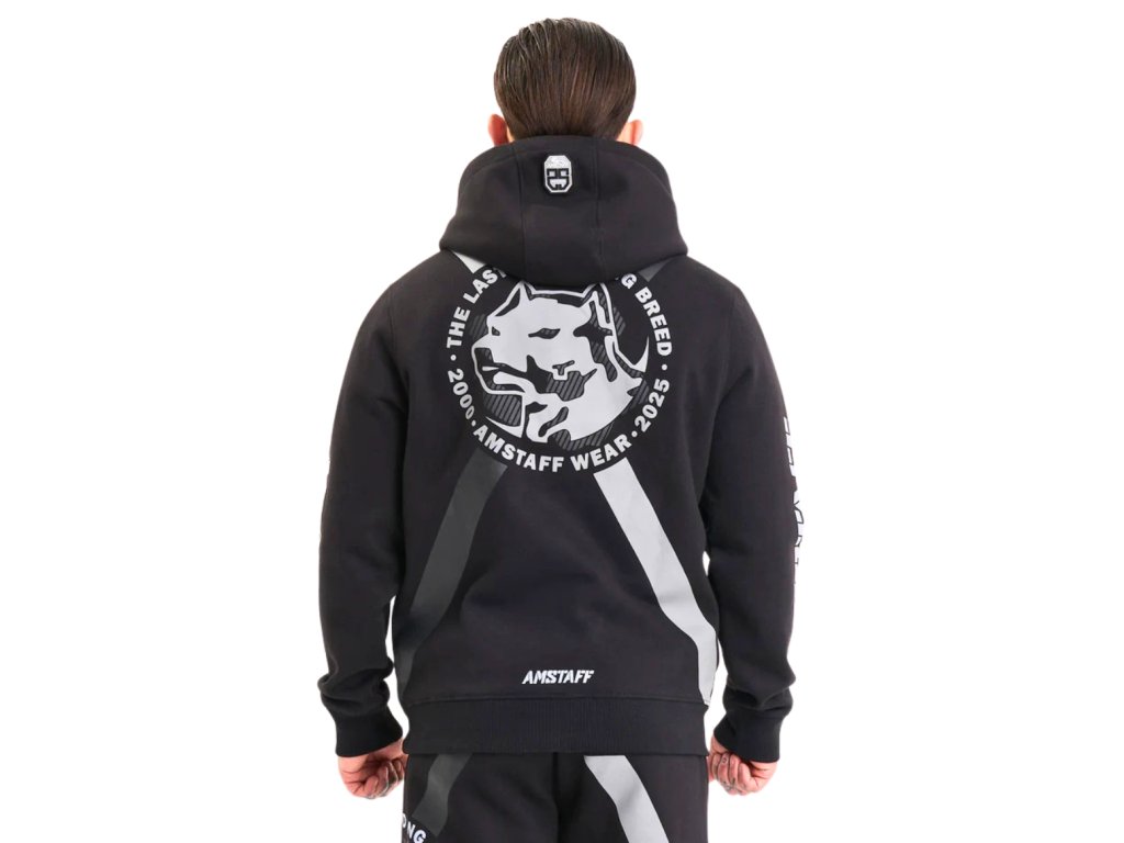 Na rukávoch sa nachádza výrazný nápis „Amstaff“, ktorý dopĺňa celkový streetwear vzhľad. Kapucňa s tunelovým sťahovaním a reliéfnym logom na zadnej strane hlavy pôsobí detailne a prémiovo. Rebrované manžety a spodný lem zabezpečujú stabilný a pohodlný strih.