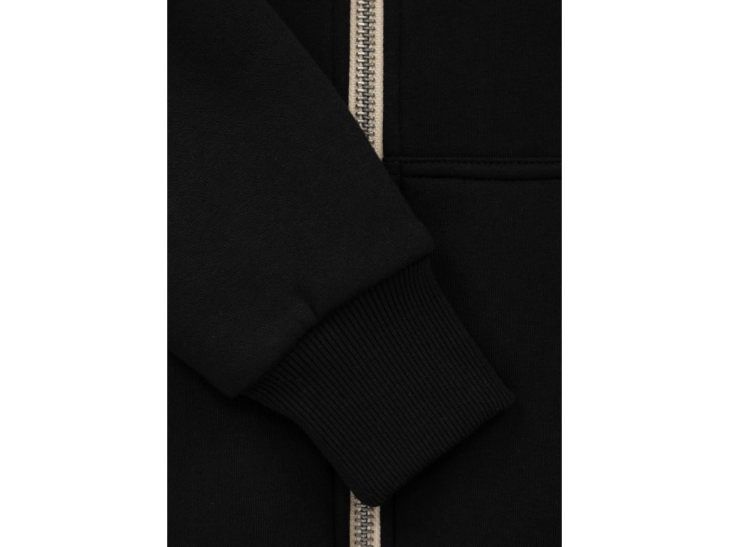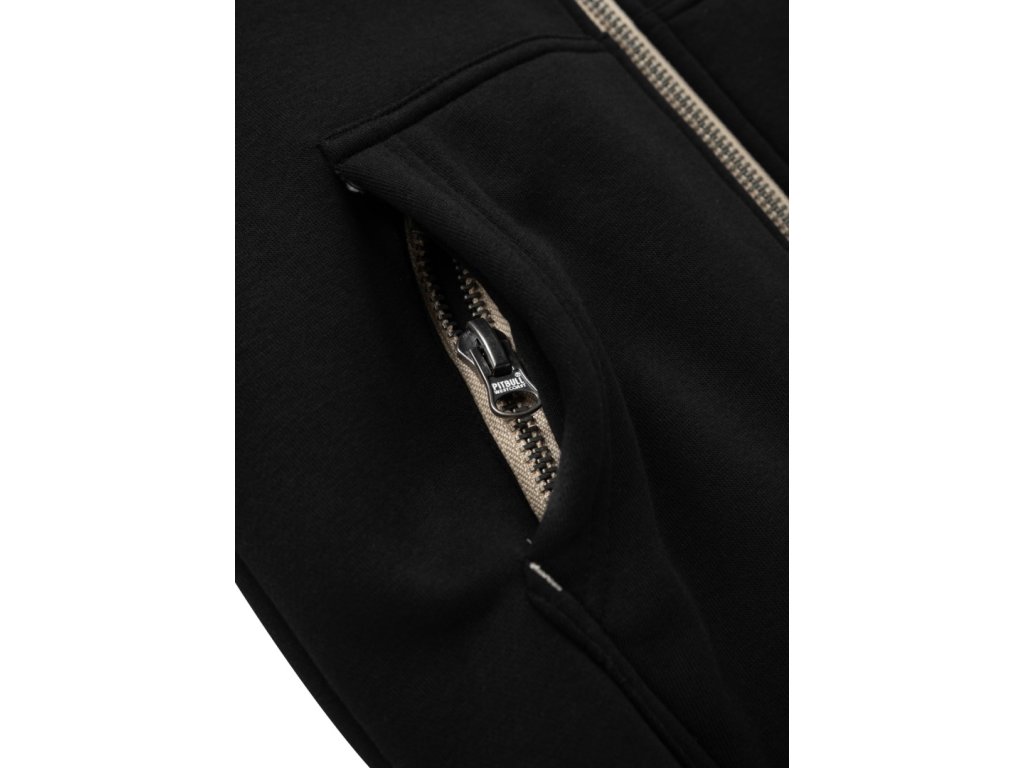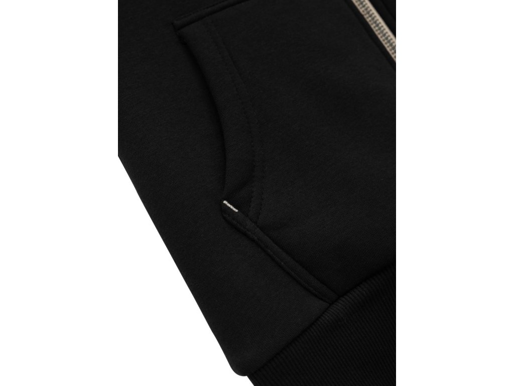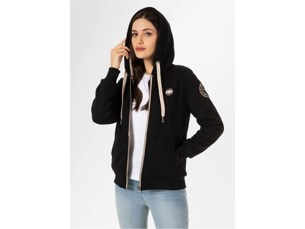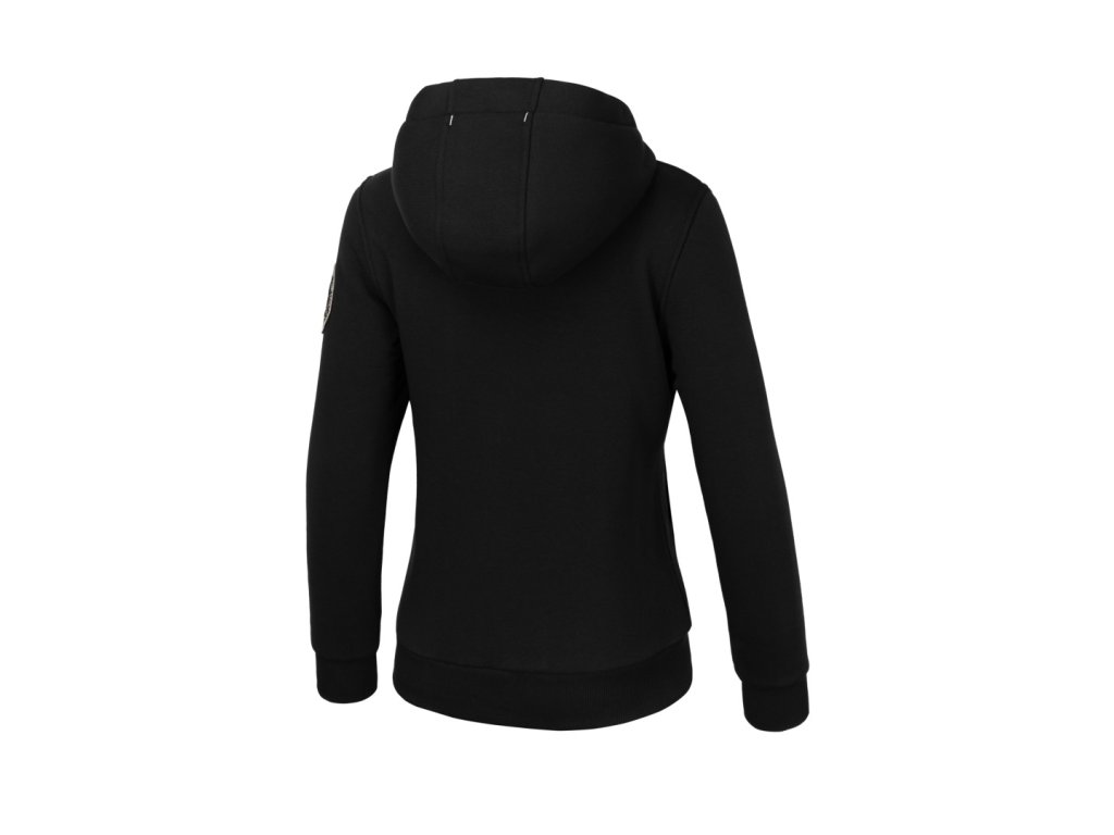Ide o klasický štýl športovej mikiny s tepelnými vlastnosťami bundy. Má mierne vypasovaný strih, ktorý sa prispôsobí ženskej postave. Je vyrobená z kvalitnej, hustej látky s gramážou 400 g/m2 a je celá silne zateplená jemnou svetlou kožušinkou. Rukávy a spodný lem mikiny sú rebrované. Kapucňa je integrovaná a regulovateľná širokou šnúrkou s kovovou úpravou. Mäkké lemovanie v mieste krku chráni pred odreninami. K dispozícii sú veľké otvorené vrecká na ruky so skrytými menšími vreckami na zips. Použité sú kovové zipy. Na hrudi je malé vyšívané logo a na ľavom rukáve okrúhla vyšívaná nášivka. Mikina je bohatá na detaily s kontrastnou úpravou a je spracovaná s dôrazom na vysokú kvalitu. Materiálové zloženie: 60% bavlna / 40% polyester. Farba: čierna.
