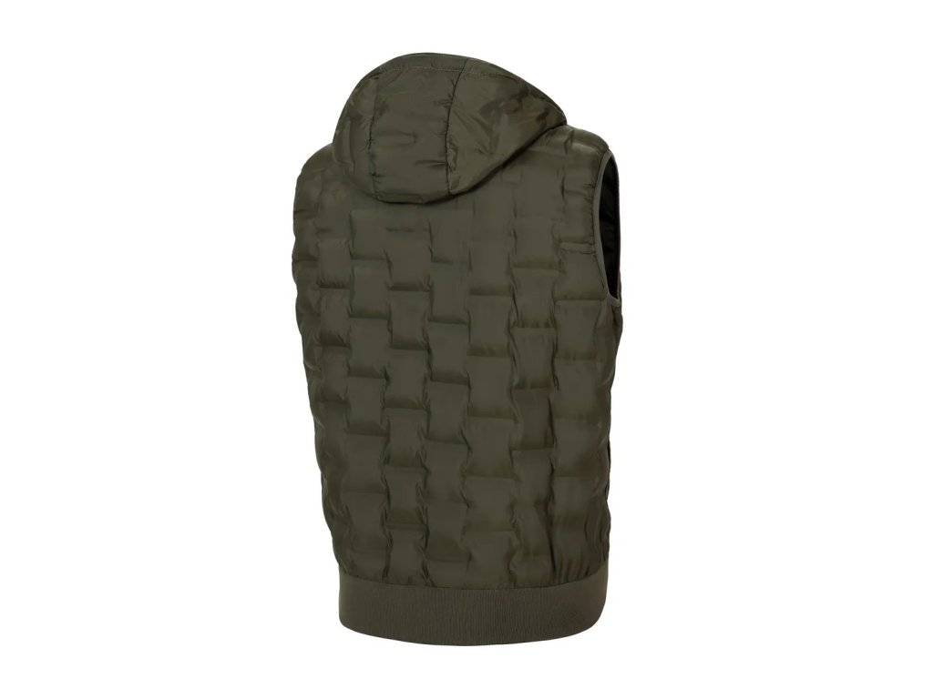 Táto pánska vesta na prechodné obdobie má klasický, pravidelný strih, ktorý končí v bokoch. Na celej ploche je zdôraznené efektné zvárané prešívanie, ktoré je vyplnené zateplením. Vesta je vyrobená z kvalitnej hrubšej polyesterovej tkaniny s hladkou podšívkou. Má integrovanú kapucňu s vysokým stojačikom a gumovou reguláciou, ktorá je vybavená šnúrkou so stopkami. Dve bočné vrecká majú zipsy s príveskami pre ľahké odopínanie. Spodná časť vesty je zatvorená širokou rebrovanou manžetou a jej prieramky sú lemované paspulou. Na hrudníku je umiestnená okrúhla silikónová nášivka s nápisom a logom značky PitBull. Materiálové zloženie je nasledovné: vonkajší materiál - 100% polyester, výplň - 100% polyester.