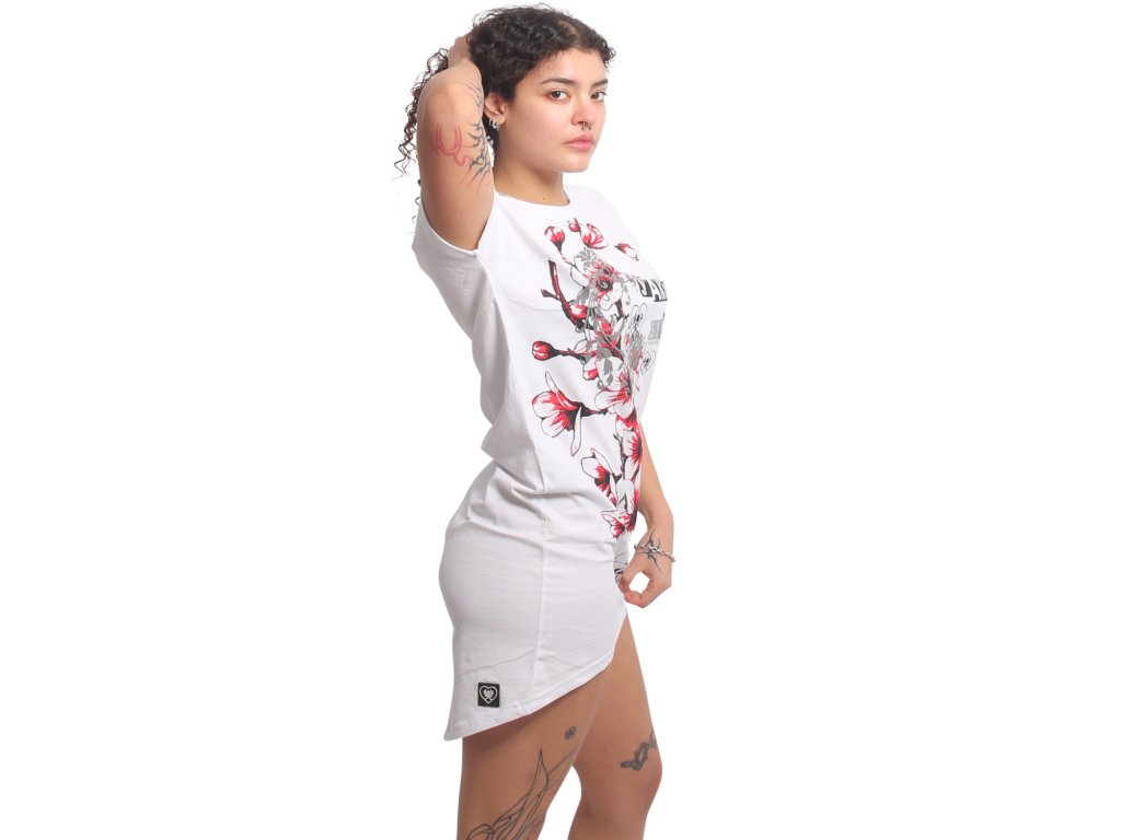 Štýlové dámske šaty Yakuza HANAMI v podobe pohodlného tričkového modelu ideálneho na každodenné nosenie v bielej farbe. Šaty majú ležérny strih – nie sú príliš úzke ani príliš voľné, takže sedia presne tak akurát. Disponujú okrúhlym výstrihom, krátkymi rukávmi a zaobleným spodným lemom, ktorý je v zadnej časti mierne predĺžený. Dizajn dopĺňa výrazná vintage potlač a logo etiketa na bočnom šve, ktoré podčiarkujú typický streetwear charakter značky Yakuza.