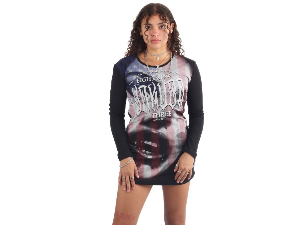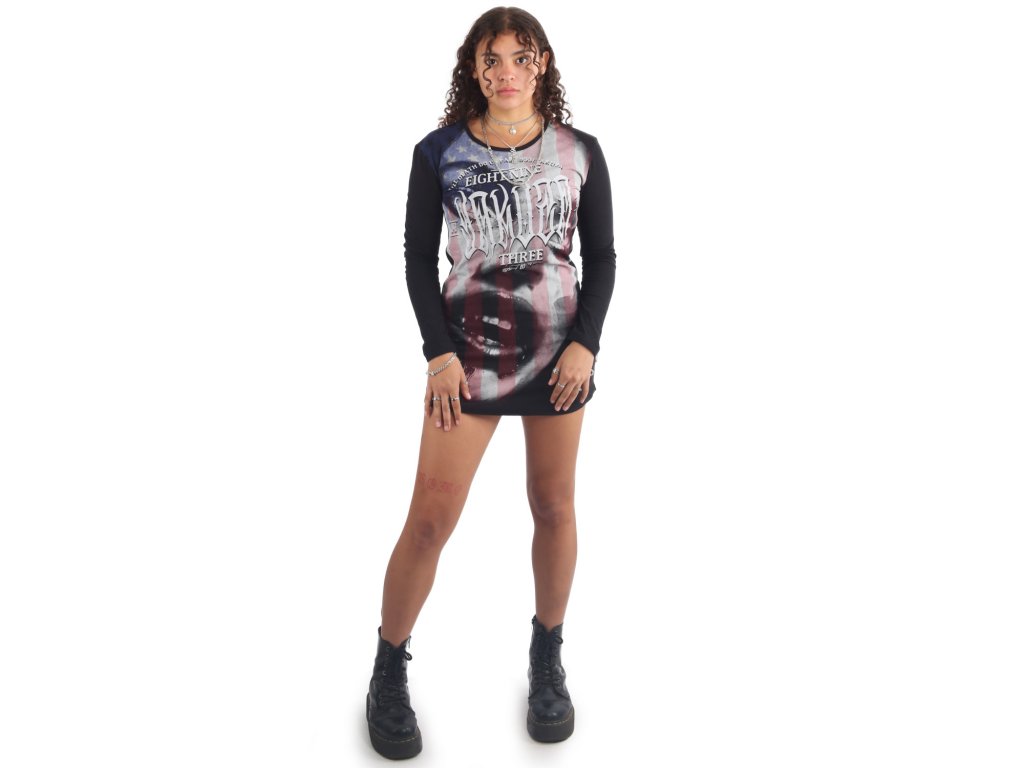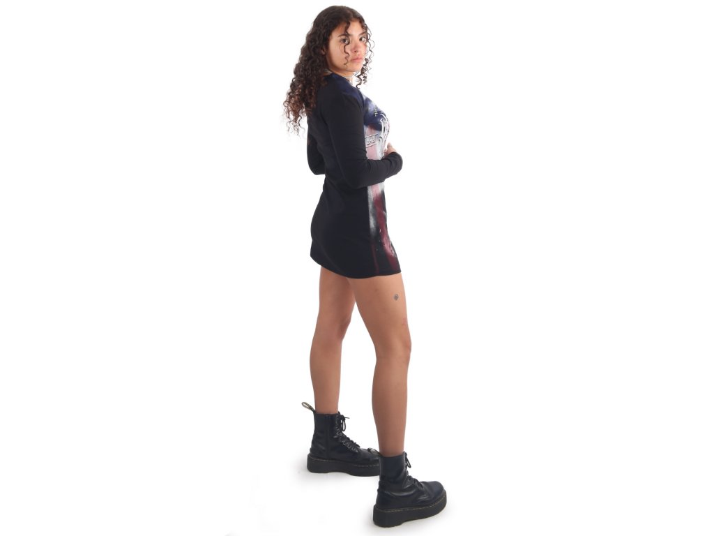 Yakuza šaty METAL CLAIM sú mäkké tričkové šaty s dlhým rukávom univerzálne strihu s celoplošnou potlačou vintage vzhľadu so zakriveným spodným lemom. Môžu byť kombinované s opätkami v elegantnom štýle, alebo s teniskami. Yakuza logo nad lemom.